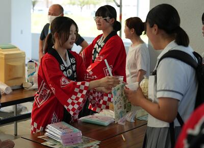同窓生のマルシェも実施され、タピオカドリンクやかき氷、ポップコーンが中学生と松高生にふるまわれましたキラキラ暑い中での実施でしたが最後にひんやりスイーツで体を潤すことができました了解