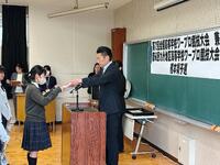 では、「第34回熊本県高等学校生徒商業研究発表大会」に出場した生徒4人と、「第74回ビジネス文書実務検定試験」1級に合格した4人、あわせて8人が表彰されました