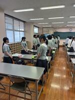 高校生「道の駅弁」販売会に向け、情報処理科と家政科の生徒が一緒に接客やマナーの学習を行いました笑顔やあいさつ、丁寧な言葉遣いなどを、ロールプレイングで実践しました