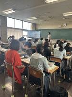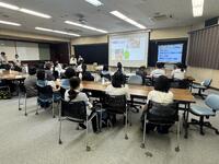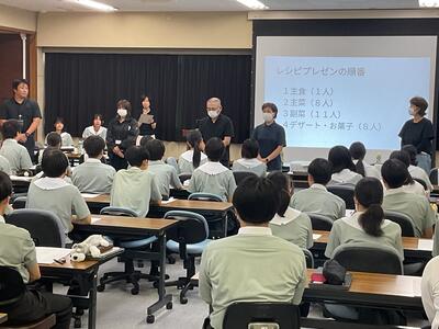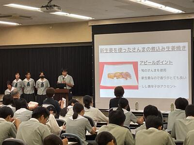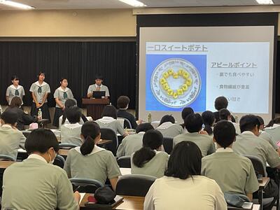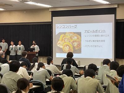 道の駅宇城彩館からご担当者様2名、そして生産者の皆様5名にお越しいただき、家政科1年生によるお弁当レシピのプレゼンテーションが行われました。「高校生道の駅弁」に向けて、生徒たちは心を込めて考案したレシピの中から、採用していただけるよう熱意をもって発表していました