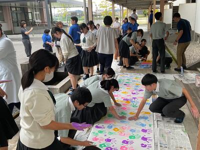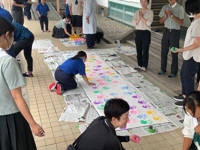 今年の松高フェスタのスローガン幕を、みんなの手形で背景を彩りました。色とりどりの手形には、それぞれの思いと個性が込められています