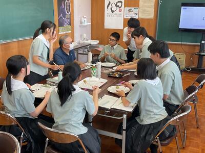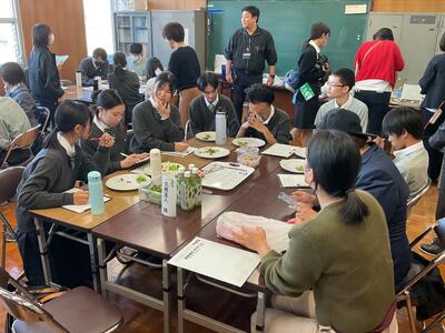 生徒が考案したレシピをもとに生産者様が作られた試作品を持参いただき、試食会を開催しました。生徒が生産者様より説明して頂いた試作品を試食しました。味や見た目、改良点などについて意見交換を行いました。生徒たちは、自分たちのアイデアが形になったことに感動し、商品化に向けた具体的な提案をするなど、貴重な学びの機会となりました。