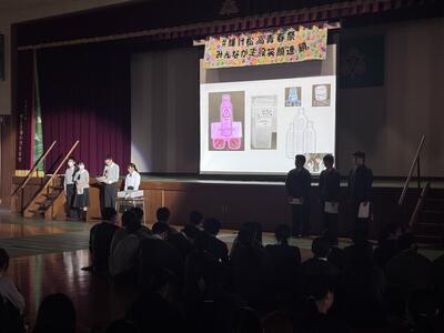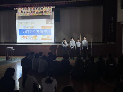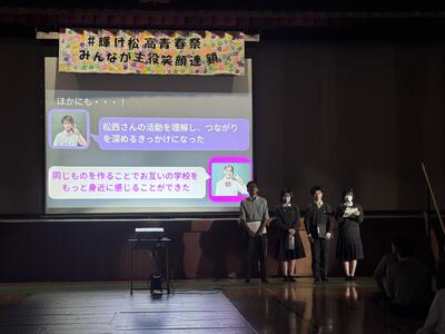 10月24日松高フェスタ(ステージ発表)を開催しました。ステージでは生徒たちが制作した動画の上映や、「コラボ商品開発」や「オリジナル商品のPR」をしました。また、美化委員会からは環境美化に関するお知らせ、保健委員会からは「ストレスと上手に付き合う方法」についての発表がありました。さらに、軽音楽同好会による迫力ある演奏と歌も披露され、会場は大いに盛り上がりました。生徒一人ひとりの個性と努力が輝く、充実したフェスタとなりました。