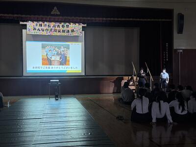 新入生を歓迎するため、生徒会主催の「生徒会入会行事&部活動紹介」が行われました副会長の本田さんが新入生に向けて「今日から皆さんも松高の一員です。不安もあるかもしれませんが、松高でしか味わえない楽しい思い出を、私たちと一緒につくっていきましょう。」と歓迎の言葉を述べました