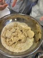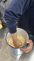 家政科の2・3年生が「味噌」を手作りしました大豆をゆでてつぶして、麹や塩などと混ぜて味噌玉を作って、空気を抜きながら樽に詰めます