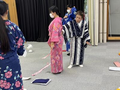 自分たちで作った「ゆかた」の着付けを、マイスターの先生にお教えていただきました