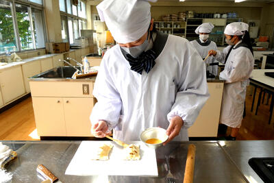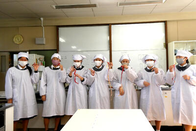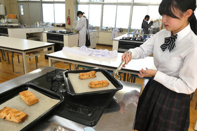 自分たちで皮をむいたりんごを使って、アップルパイ作り(こちらが本命)手際よく作る姿はさすが家政科3年生