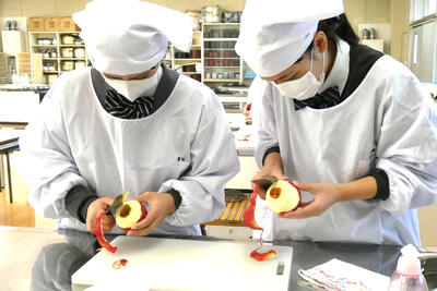 2年生が「りんごの皮むき選手権!?」包丁の使い方に気をつけながら、誰が一番上手
