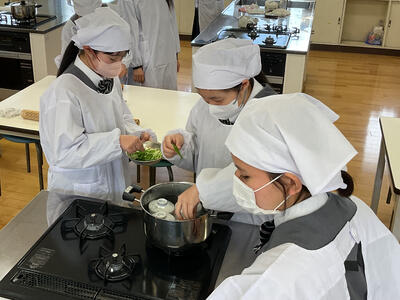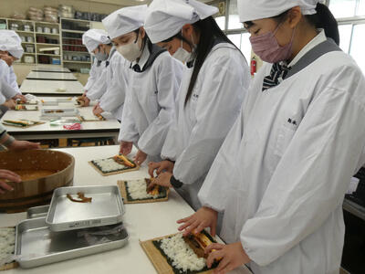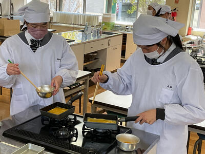 2年生が、巻きずし・茶碗蒸し・きゅうりの酢の物を作りました。巻きずしは具材の並べ方や巻き方に気を付けながら、きれいに仕上げることができました。茶碗蒸しは、だしの風味を大切にし、なめらかな食感になるよう丁寧に作りました。きゅうりの酢の物は、さっぱりとした味付けで和食のバランスを学ぶことができました。