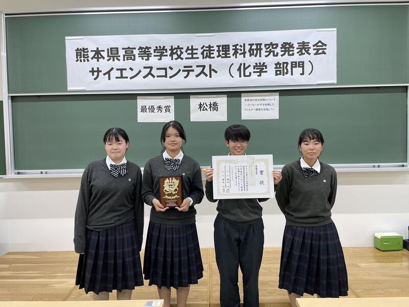 今年は「食用油の劣化抑制~コーヒーかすを利用したフィルター開発を目指して~」という研究テーマで実験を重ねてきました。そして、なんと!「最優秀賞」をいただくことができましたお祝い九州大会出場決定ピース来年の県総文祭でも発表します花丸これからもサイエンス部の活躍にせひご注目くださいキラキラ
