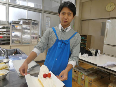 3年普通科の選択科目「フードデザイン」の授業で、ブッシュ・ド・ノエル作りに挑戦しました。スポンジ生地を丁寧に焼き上げ、クリームを巻き、木の幹をイメージして仕上げました