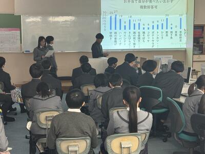 | 地域に貢献するための課題解決能力を養います。 | 模擬取引を通して、商品・お金の流れを確認し、決算書の作成も行います。 | 地域の食材を活用した商品を、自ら考えプレゼン・開発します。 |
