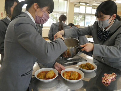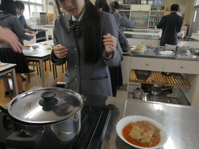 2年生のフードデザインの授業で、ロールキャベツ作りに挑戦しました。家庭科・調理キャベツで具材を丁寧に包む作業に苦戦しながらも、協力して調理を進めることができました。音楽煮込むことで味がしっかりと染み込み、見た目も味も満足のいく仕上がりになりました。了解