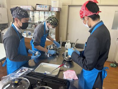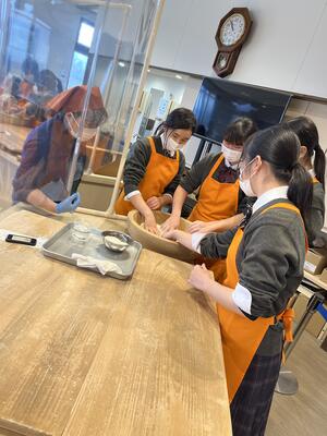 家庭基礎の授業で調理実習をしました家庭科・調理献立は「包子饅頭(パオツマントウ)」「拌三絲(バンサンスー)」の2品ですピース包子饅頭は生地から作りました!きれいに膨らんでいましたねニヒヒ薄焼き卵や、きゅうりの千切りも上手にできましたグループ班で協力しながら楽しそうに作っていましたにっこり
