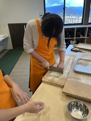 生徒の感想「初めて体験しました!。こねるときが一番難しかったです。そば切りは日頃の実習の成果が出せて、同じ太さに切ることができました。みんなで食べたそばはとても美味しかったです。」