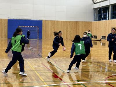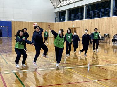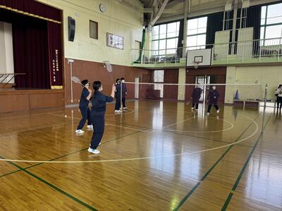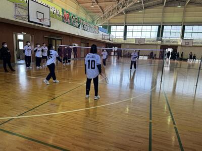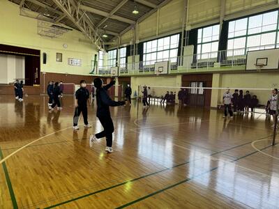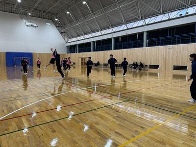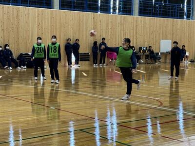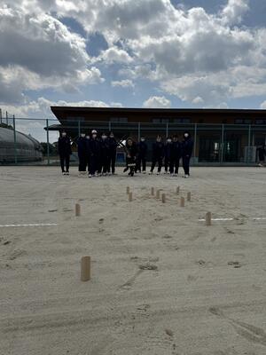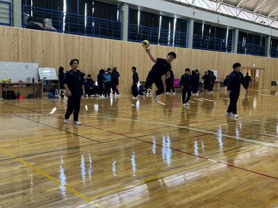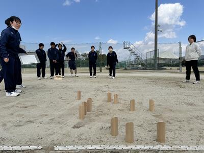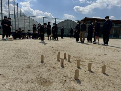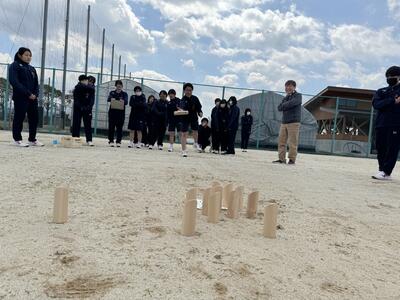 ハンドボールとバドミントンをし、最後に外で「モルック」を体験笑う