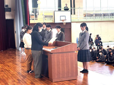 午後は、体育館で表彰式が実施されました。上位の生徒が20人が登壇し、校長先生から表彰状をいただきました