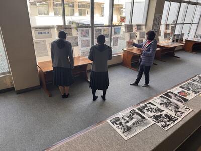 新日本婦人の会宇城支部さんによる「語りつごう戦争~高校生が描いた原爆の絵展~」が、12/2(火)より12/9(火)まで図書館前の窓際スペースで展示されました。内容は、高校生が被ばくされた方から聞き取って描いた原爆の絵を中心に、松橋駅空襲の絵や三角の戦争遺構、原爆写真などの展示でした。戦後80年の今、平和の尊さと過去の教訓を、次の世代へ伝えていってほしいと思います。