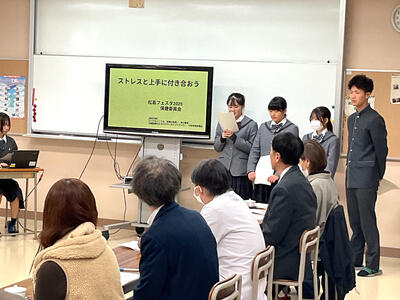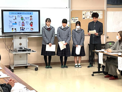 1月13日、学校医の先生や学校薬剤師さん、PTA会長をお招きし学校保健委員会が実施されました。保健委員の生徒が「ストレスと上手に付き合おう」をテーマに、日常生活の中で感じやすいストレス