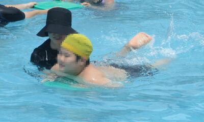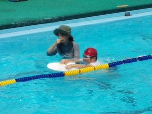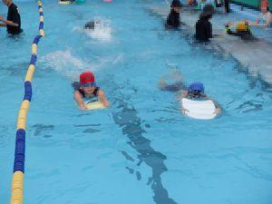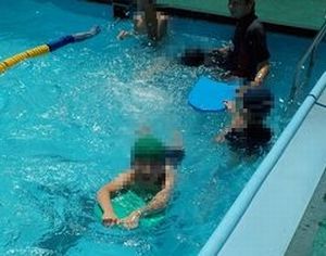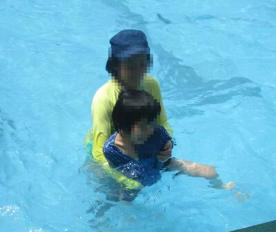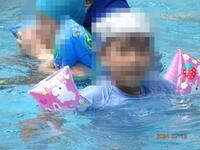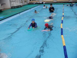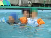 バシャバシャと水慣れをした後、潜ったり、浮かんだり、バタ足をしたり、ビート板を使って泳いだりと、それぞれの目標に向かってがんばっています。