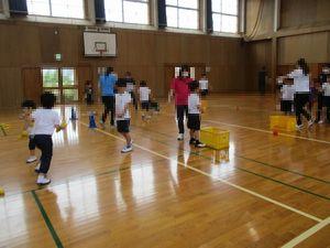 6/17(水)体育で小学部1年生と2年生で交流をしました。「くだものをあつめよう!」と題し、玉に見立てたりんごやバナナをそれぞれの籠に入れる競技をしました。今年度は、新型コロナウイルス感染拡大防止のため籠と籠の距離を離し、投げる位置も一人一人の距離を取って投げるようにしました。猿の籠にりんご、象の籠にバナナを入れます。「よーいドン」の合図で両学年が果物を籠に入れていきました。さすが2年生は、速く入れてしまいました。が、1年生の果物がまだ余っているのに気づき手伝いに来てくれた2年生です。まだ、学校が再開し、2週間しか経っていない1年生に優しくしてくれた瞬間でした。