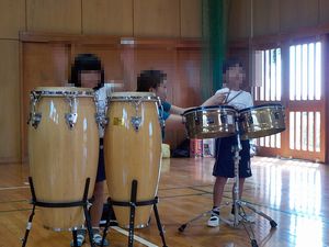 「剣の舞」や「虫の声」など、児童になじみのある曲に合わせて、ティンパニーやコンガ、ボンゴなどの楽器の音色を聴いたり、歌ったりしました。