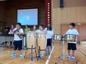 また、自分の好きな楽器を選んで、よく知っている曲に合わせて、九州打楽器合奏団のみなさんと一緒に演奏をしました。普段あまり触れる機会がない楽器を鳴らす経験もすることもできました。子どもたちの笑顔があふれる時間となりました。