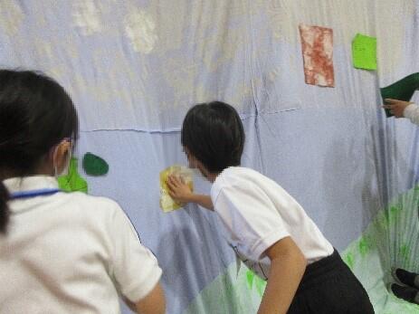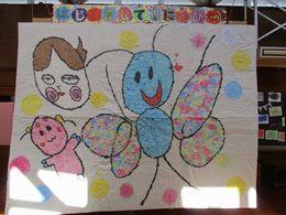 今まで、クレヨンやクーピーなどを使って、好きな絵を描いたり、色塗りをしたりしてきた1年生。2学期は、初めて絵の具にチャレンジしました。好きな色を選び、直接絵の具を指につけ、ダイナミックに布に塗ったり、手形や足形をつけたりしました。
