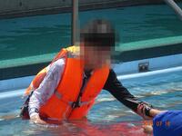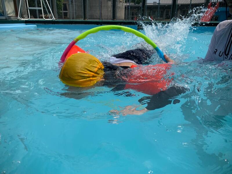 最初はバタ足や体や顔に水をかけたり、宝探しをしたりして水慣れをし、その後は1人1人の目標に向かって練習に取り組みました。