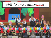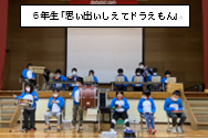 1年生は「やまのおんがくか」の曲に登場する動物になりきって、手作りバイオリンやピアノ、フルート、太鼓を演奏しました。6年生からの「アンコール」にこたえ、みんな嬉しそうにもう一度演奏をしました。6年生は、「6年間をふりかえろう」と題し、1年生から6年生までの担任の先生や頑張ってきた行事を振り返り紹介をしました。また、一人一人の思い出も発表しました。最後は6年間の感謝の気持ちをダンスで表現し、1年生から盛大な「アンコール」を受け、更に力強く、かっこよく踊り、大盛況で発表会を終えました。