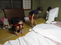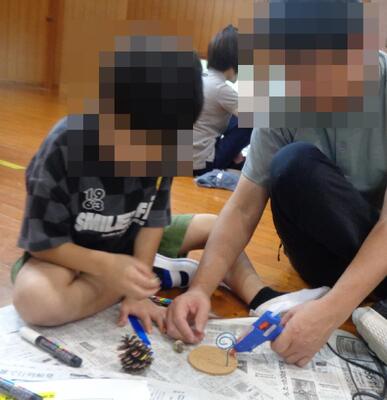 初日の創作活動では、木の実やビーズ等を使ったフォトスタンドを作りました。子どもたちはそれぞれオリジナルのフォトスタンドを作り、思い出に残る記念品ができました。夜はキャンドルの集いを行い、静かに揺れる炎を見ながら、1日を振り返りました。また、食事や入浴のルールもしっかり守り、布団やシーツを友達と協力して出したり、たたんだりすることができました。