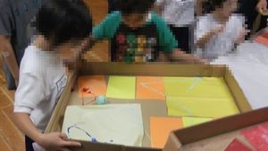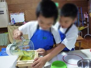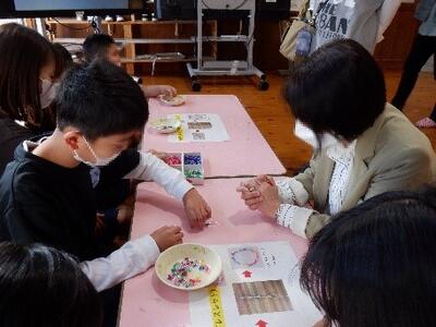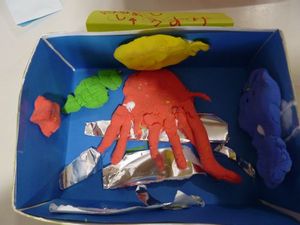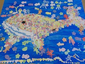 1年生は、6月の生活単元学習「つくって あそんで ありがとう ~ちいきのひとと なかよくなろう」で、ボウリング、ストロー飛行機などのおもちゃ作りをしました。また、「ゆめとんぼまつばせ」の池田隆美さん、上原典一さんを招いて、遊びを教えていただきながら、交流を深めました。2・3年生は「つくろう あそぼう しょうたいしよう」で、おもちゃやスポーツの道具、飾るための作品を作って楽しみました。1年生を招待して一緒に遊んだり、作品を4・5・6年生に紹介したりもしました。4・5・6年生は「紙すきワンダフル2018」で、牛乳パックを使って和紙作りをしました。作った和紙でメッセージカードを作ったり、細かくちぎって大きなくじらの貼り絵を協力して作ったりしました。