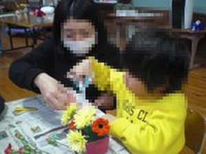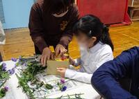また、2月14日(木)にはフラワーアレンジメント体験を行いました。ガーベラやカーネーションの花を切り、オアシス(スポンジ)に挿して、一人一人の個性溢れるきれいな作品ができました。日本文化に親しむ心や造形への関心を高めることができました。