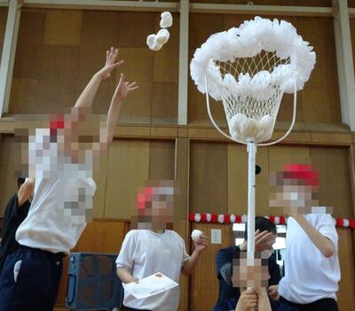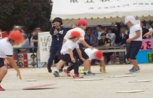学部団体競技「せんべい、焼けたかな?」では、ダンボール製のせんべいをどんどんひっくり返したり、ゆっくりと1つずつ確実にひっくり返したりして、自分の団の色のせんべいの数を増やしました。結果は、赤団、白団、同点でした。