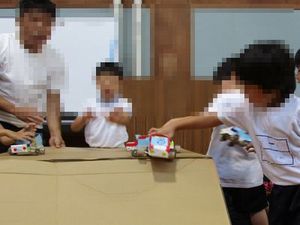 午前中はプレイルームで、自己紹介をしました。その後、ボール運びリレーやトヨタ車イラストつきのフラフープリレーなどのレクレーションを行いました。ゲームを一緒にすることで、子どもたちの顔がほぐれ、自分から話しかけたり、一緒に遊んだりする姿が見られました。