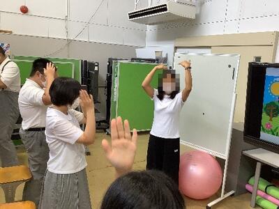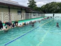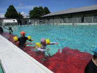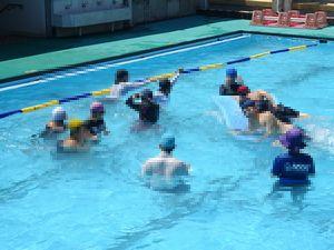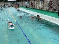 マットを設置して、水深の浅い場所で、浮き輪やビート板などを使いながら教師と一緒に浮いたり泳いだりして楽しみました。 壁に手をかけて、体を一直線に伸ばして、バタ足の練習をしました。疲れてくると、足が下に沈んでしまうので、水面に近い位置でのキックを頑張りました。 一人で浮いたり泳いだりできる生徒は、25mをさまざまな泳法で泳ぐことができました。