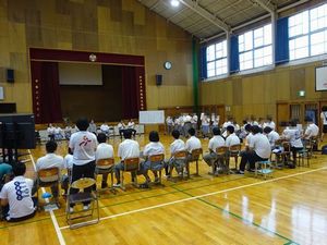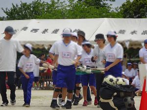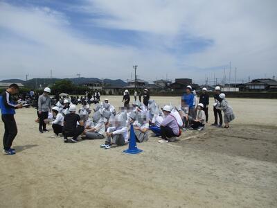 また今年は「ラグビーワールドカップ2019」が熊本県で開催されることにちなんで、団体競技では「One for all , All for one 一人はみんなのために、みんなはひとりのために」と題して、ラグビーのプレーをイメージした4つの種目を取り入れて行いました。それぞれの種目とも友達と呼吸を合わせながら、協力して取り組むことができました。