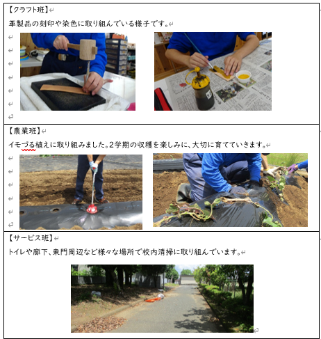 授業が再開し、早速作業学習でのグループを決めるため、作業アセスメントを行いました。「農業班・窯業班・クラフト班(木工)・クラフト班(革工)・サービス班」の5つの作業をクラス毎に分かれて、全員が体験しました。