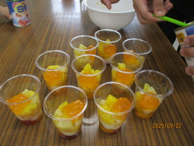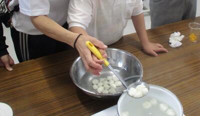 白玉を茹でたり、フルーツを切ったりと協力しながら調理をすることができました。