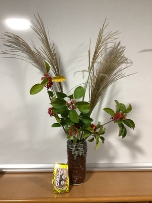 1年生は「秋探し」をテーマに校内を散策し、色づいた落ち葉やすすきを見つけて季節の移ろいを感じました。また、見つけた「秋」を使って制作した生け花やガーランドを昇降口に飾り、他学年の生徒や来校された方にも秋を感じていただくことができました。