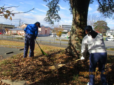 車の出入りもある中、役割分担をしながら効率よく落ち葉を集めて綺麗にすることができました。