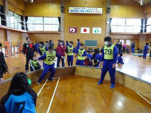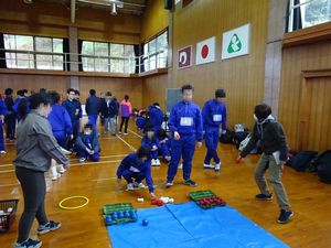 高等部は2月15日(金)の送別遠足で、豊野少年自然の家に行きました。当日は残念ながら雨天だったため、体育館でニュースポーツ(ストラックアウト、転がしドッジボール、ペタンク)を行いました。1年生から3年生までの縦割り8チームに分かれて得点を競いました。各チームとも作戦を練り、笑顔で協力しながらゲームを楽しみました。3年生とも楽しい時間を過ごすことができ、思い出に残る1日になりました。