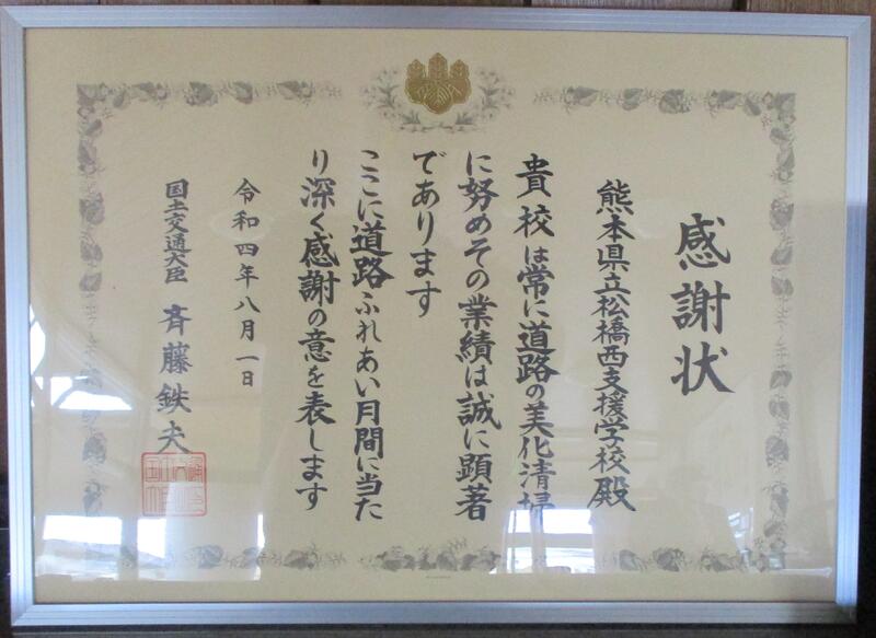 本校ではこれまで環境教育の一環として、学校周辺の清掃や花壇整備等の活動に取り組んでおります。これまでの取組と実績を評価していただき、国土交通省より大臣感謝状を受賞しました。これまでの活動では、松橋町8区のボランティアの皆様と一緒に活動させていただき、安全に取組を続けられたことに感謝申し上げます。