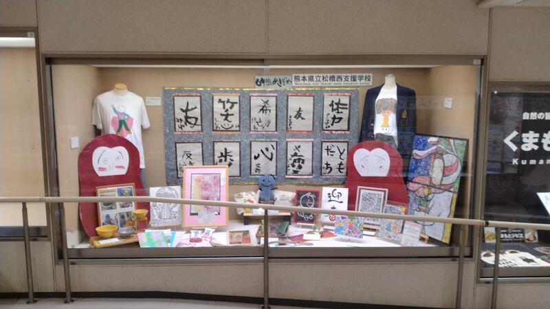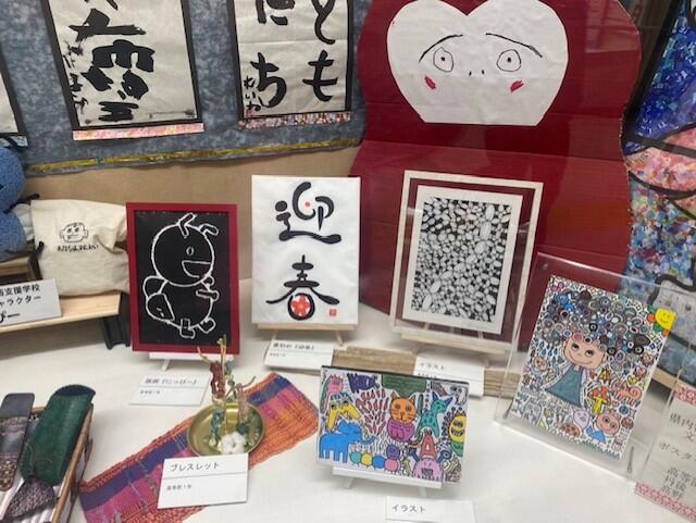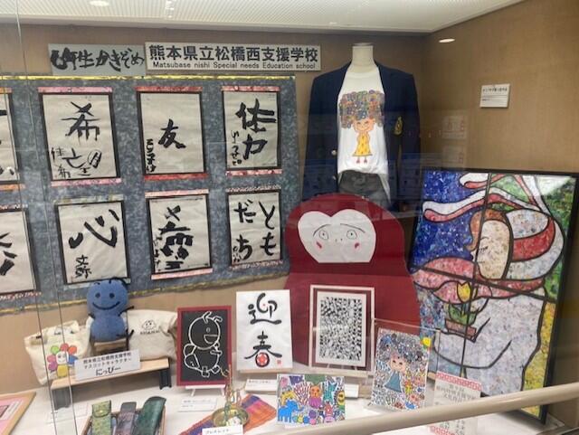 2月17日(月)から2月28日(金)に、県庁地下通路で、本校小学部の児童、中学部、高等部、分教室の生徒の作業製品や書初め、オリジナルデザインTシャツなどを展示しました。たくさんの方々に見て頂くことができました。
