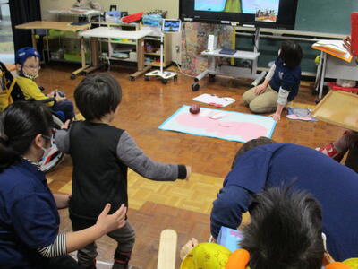 体育では、目標のボールめがけてボールを投げて、目標のボールを動かしてゴールに入れる活動を行いました。