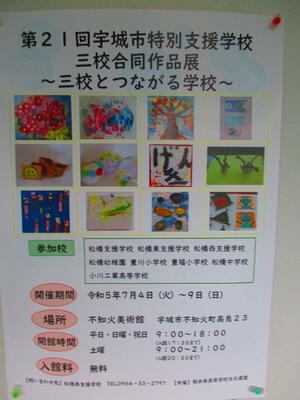 宇城市特別支援学校三校(松橋支援学校・松橋西支援学校・松橋東支援学校)及び三校の交流相手校の作品や作業製品等を一堂に展示する、三校合同作品展を開催しています。