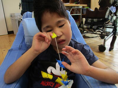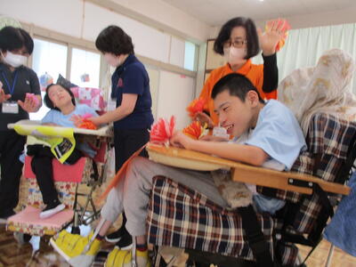 本校では10月21日に創立50周年記念式典が行われます。希望教室では、式典で使用する花作りを行いました。小学部は学校の壁面に飾るコスモスを作りました。色やイラストなどを工夫し、個性豊かなコスモスができあがりました。中学部は式典の2部で使用する花を作りました。得意な作業、やりたい作業毎に役割分担し、和気あいあいとしながらもてきぱきと集中して取り組んでいました。これから仕上げを行い、できあがった完成品を本校に届けます。