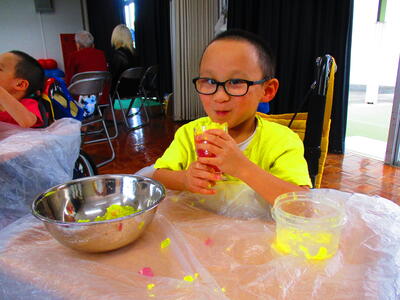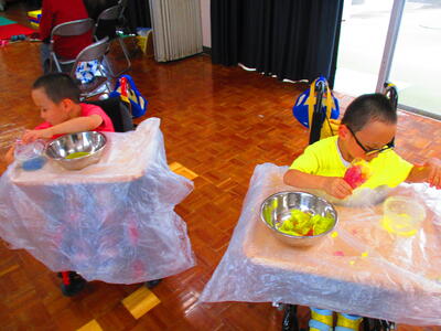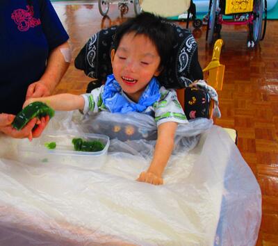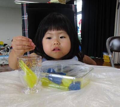 幼稚部では、寒天ゼリーで感触遊びを行いました。