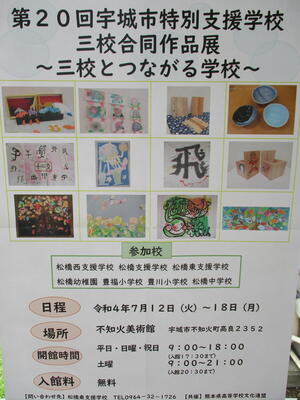 宇城市特別支援学校三校(松橋支援学校・松橋西支援学校・松橋東支援学校)及び三校の交流相手校の作品や作業製品を一堂に展示した三校合同作品展を7月18日(月)まで宇城市の不知火美術館で開催しています。