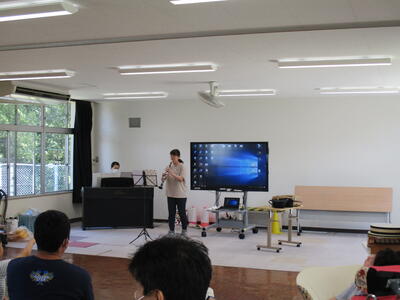 音楽の時間では、楽器紹介の後、実際に先生達によるクラリネットとピアノ演奏の披露がありました。